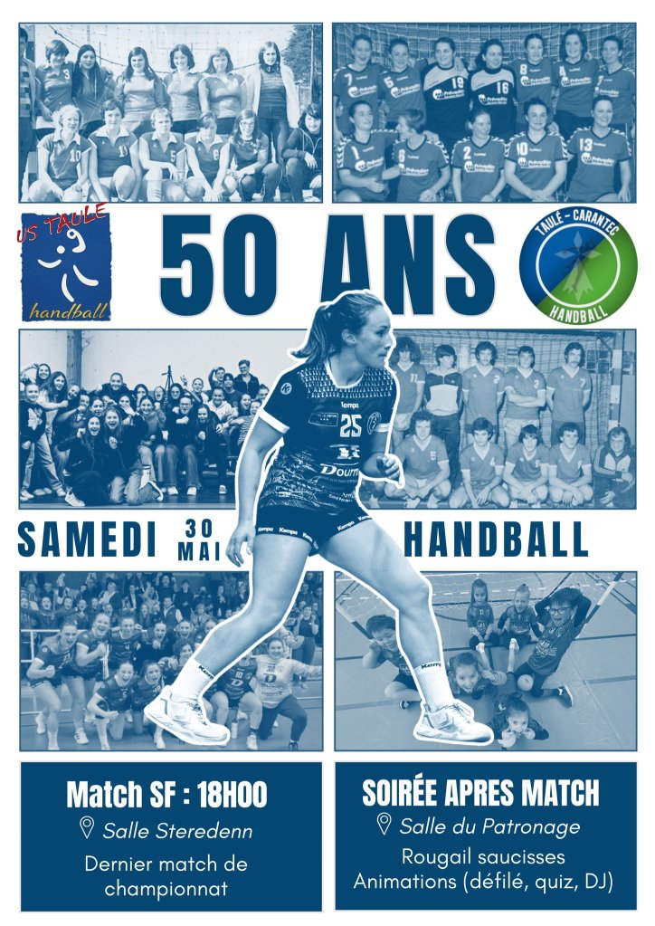 Un demi-siècle, ça se fête ! Le Taulé-Carantec Handball vous donne rendez-vous pour célébrer ses 50 ans lors d'une journée historique. Au programme : un après-midi 100 % hand au gymnase avec nos équipes féminines, suivi d'un grand repas festif autour d'un rougail saucisse à la Salle du Patro. Découvrez le programme et réservez vite vos places !